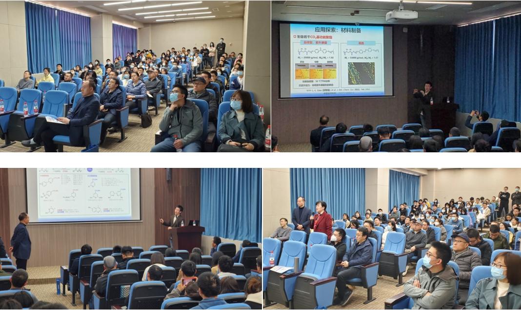 余达刚教授重点介绍了课题组近期聚焦在二氧化碳参与的有机合成方法学发展方面的最新进展,主要包含“CO2=CO+O”理念在羰基杂环合成中的应用,基于“可见光促进CO2单电子活化”策略和“自由基型CO2催化有机转化”模式的CO2选择性转化,以及CO2化学在药物和功能材料合成方面的应用,变废为宝,服务国家战略需求。整场报告内容丰富,余老师讲解思路清晰,由浅入深,形象生动地向我们展示了他们课题组在二氧化碳高附加值合成转化研究中的系统性工作。在随后的自由提问环节,在座的师生和余老师进行了深入地讨论交流,大家都表示获益匪浅。报告在全场师生热烈的掌声中落下帷幕。结束后部分教师与余达刚教授进行了合影留念。