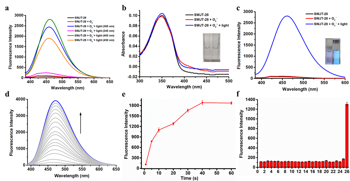近期,kaiyun开云官方王雅雯教授带领研究团队合成了一种以四嗪为识别基团的荧光探针SWJT-28,并首次提出“光辅助激活”策略。研究表明,该探针可以在450nm的蓝光照射下快速与超氧阴离子发生反应并产生荧光。与传统的接力识别策略不同,该探针需要蓝光和超氧阴离子同时存在才能开启荧光,实现了一步激活,显著缩短了光照和响应时间(<40秒)。这种新的反应方式可以帮助监测细胞中超氧阴离子在任意时间点的浓度以及整体波动情况。基于此,作者成功将其应用于HeLa细胞和氧葡萄糖剥夺模型的时间控制成像,验证了SWJT-28在氧化还原研究中的实用性。