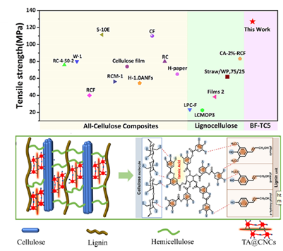 受天然植物结构中纤维素-半纤维素-木质素缔合结构的启发,kaiyun开云官方周祚万教授课题组以单宁酸改性的纤维素纳米晶(TA@CNCs)代替半纤维素作为跨尺度桥联剂,在竹生物质全组分溶解液再生成膜过程中桥接纤维素和木质素组分(图1)。通过对竹粉溶解、凝胶化及再生过程以及TA@CNCs的结构调控,制得了高强度竹基复合膜材料。当TA@CNCs增强体用量为5 wt%时所得竹基薄膜的力学强度达到127.2 MPa,相较于纯竹基薄膜提升了130%。