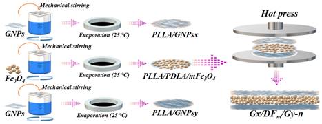 针对聚合物基复合材料导热性能和低反射电磁屏蔽性能难以同时兼顾的问题,kaiyun开云官方王勇教授课题组制备了一种非对称三明治结构的左旋聚乳酸(PLLA)基复合薄膜(图1)。通过调控顶层和底层薄膜石墨烯纳米片(GNPs)的非对称分布,以及在中间层引入少量右旋聚乳酸(PDLA)和磁性粒子Fe3O4,得到了具有高导热和低反射电磁屏蔽效能(EMI SE)的PLLA基复合薄膜。当GNPs和Fe3O4含量分别为5.61 wt%和4.39 wt%,薄膜厚度仅为300 μm时,具有非对称结构的PLLA复合薄膜的面内热导率和EMI SE分别达到7.49 W m - 1 K - 1和41.7 dB,相较于具有对称结构的PLLA基复合薄膜分别提升了126.8%和26.4%。