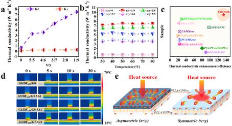 图2. (a)不同x:y比值的Gx/DF4.39/Gy-5.61复合薄膜面内和面外热导率;(b)在GNPs含量为5.61 wt%时不同x:y比值的PLLA基复合薄膜的面内热导率随温度的变化;(c)比较了本工作和其他层状结构复合薄膜的导热增强因子;(d)PLLA复合薄膜的红外热成像图;(e)PLLA基复合薄膜的热传导机理示意图