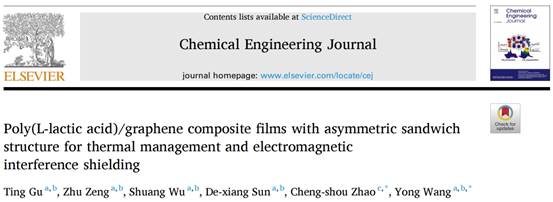 综上,本研究以可再生PLLA作为聚合物基体,通过合理设计填料的非对称分布和引入少量磁性粒子,实现了导热性能和低反射电磁屏蔽性能的同步提升,并且保持了PLA基复合薄膜良好的机械性能。这一研究结果为制备兼具高导热性能和电磁屏蔽性能的聚合物基可再生复合薄膜提供了新的方向。相关成果以“Poly(L-lactic acid)/graphene composite films with asymmetric sandwich structure for thermal management and electromagnetic interference shielding”为题发表在Chemical Engineering Journal. DOI: 10.1016/j.cej.2023.143190。论文的第一作者为2019级博士研究生辜婷,通讯作者为kaiyun开云官方王勇教授和kaiyun开云官方地球科学与环境工程学院赵乘寿副教授。