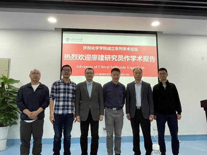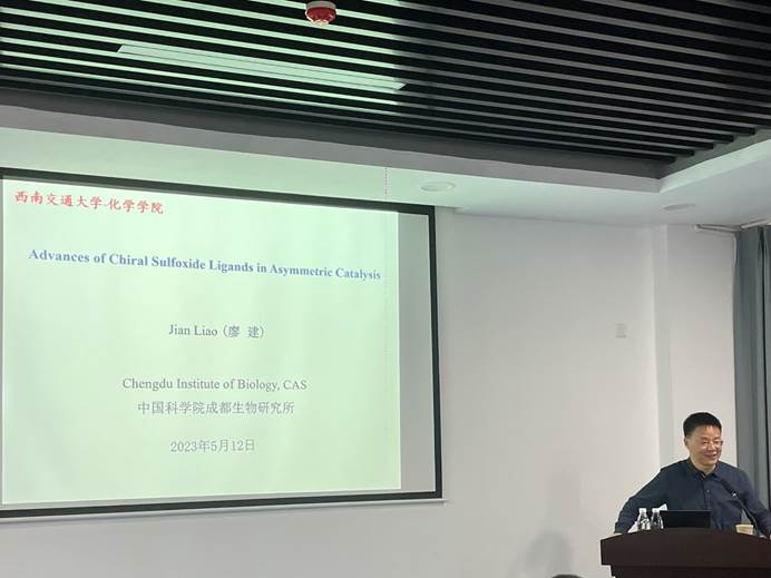 5月12日上午,中国科学院成都生物所廖建研究员应彭羽教授邀请来校交流,并以“Advances of Chiral Sulfoxide Ligands in Asymmetric Catalysis”为题做了一场精彩的学术报告。此次报告会在九里校区工业中心C座203会议室举行,由kaiyun开云官方院长周祚万教授主持,kaiyun开云官方部分教师和研究生参加了此次学术交流活动。