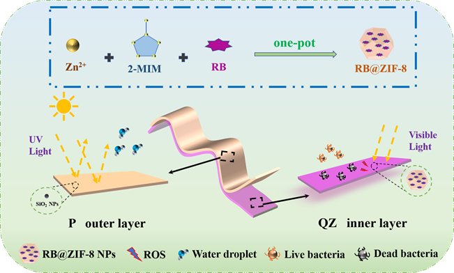 针对难以开发具备多功能复合膜的问题,kaiyun开云官方王萃娟课题组通过将金属有机框架与抗菌光动力疗法相结合的策略,制备了一种基于ZIF-8的新型多功能抗菌复合薄膜。将光敏剂孟加拉红(RB)在室温通过一锅法包封至ZIF-8中,得到RB@ZIF-8 NPs。在以聚(ε-己内酯)(PCL)和聚乙烯醇-季铵盐壳聚糖(PVA-QCS)为基质的薄膜中掺杂SiO2和RB@ZIF-8 NPs,以形成具有光动力杀菌的PQZ复合膜(图 1)。