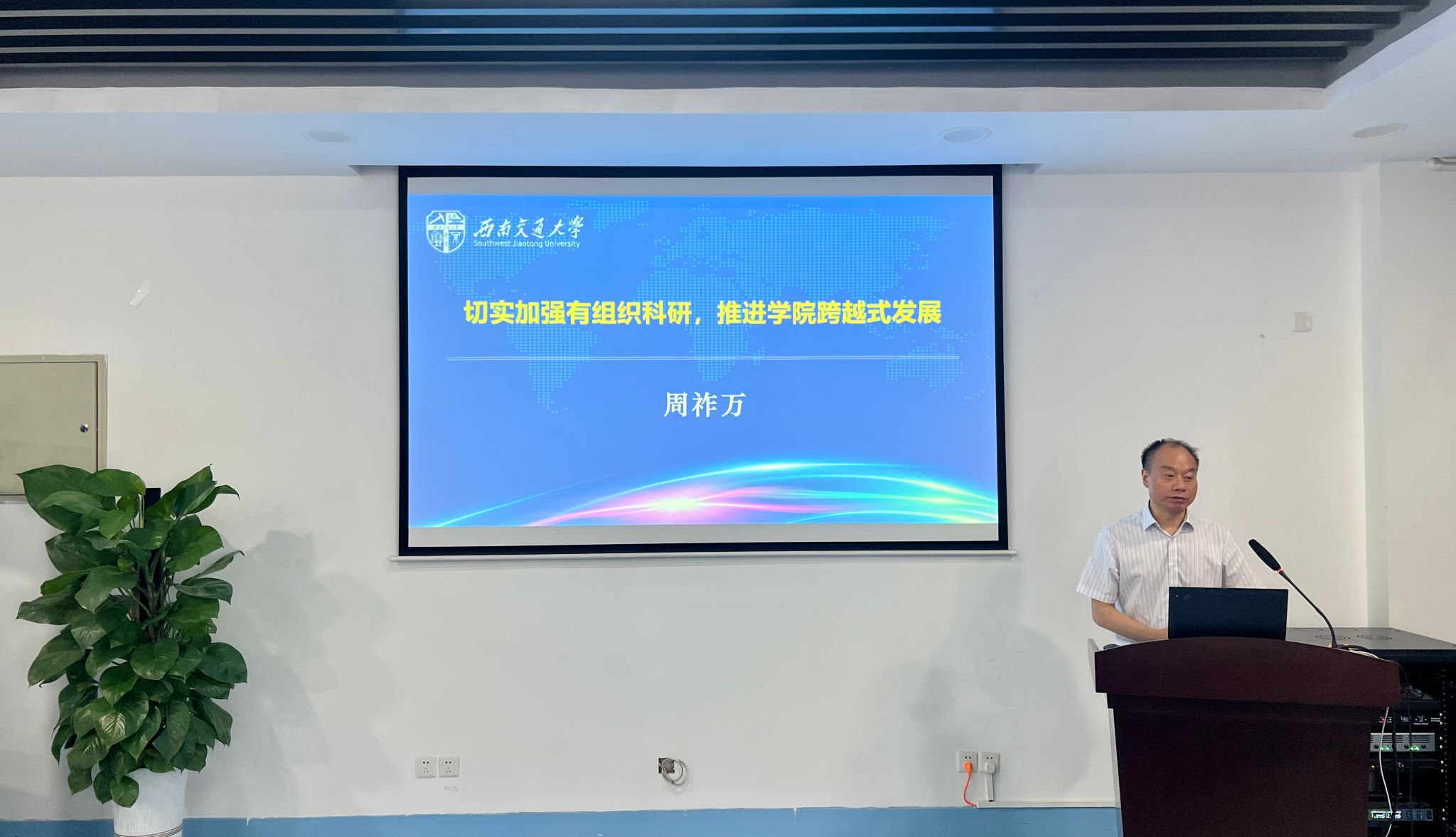 周祚万强调,学院要以习近平新时代中国特色社会主义思想为指导,紧紧围绕学校“双一流”建设的总体目标,加强有组织科研,提高科研质量和水平。要做到紧紧围绕学院四大重点研究板块,确定学科建设定位、制定科研发展规划,以科研项目为牵引、谋划高质量科研成果。学院全体科研人员要结合自身实际,制定科研规划和目标,积极申报各类科研项目,加强团队协作和交流合作,提高科研成果的转化率和影响力。希望学院能够借鉴和借力科研院的经验和资源,加强与科研院的沟通和联系,以此次推进会为契机,进一步激发科研热情和创新激情,为学院的科研工作开创新局面,为学校“双一流”建设全局做出新的更大的贡献。