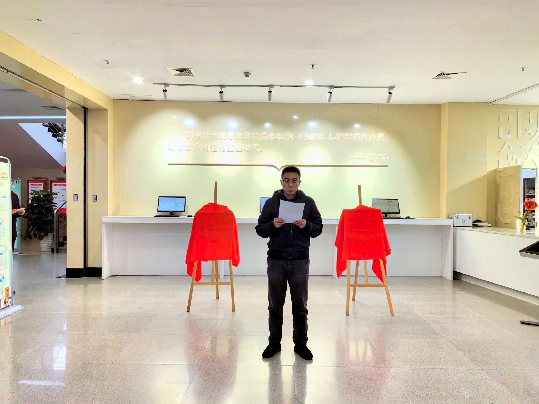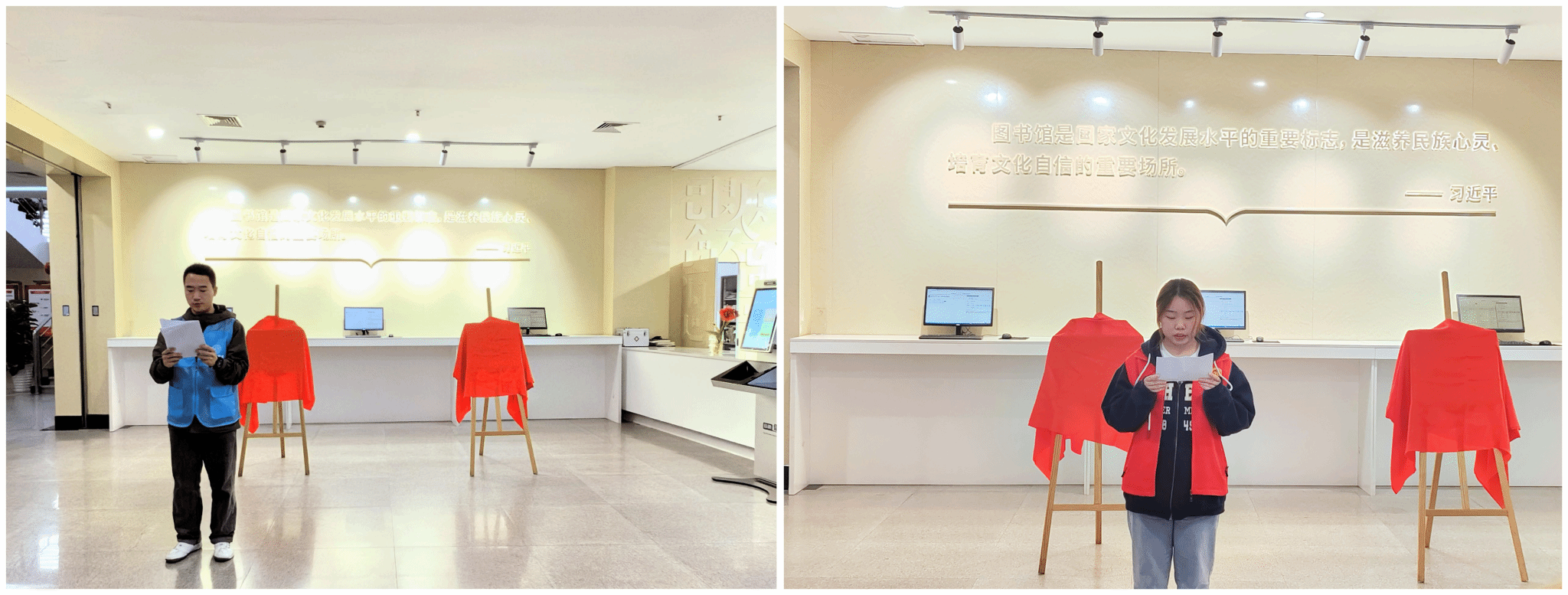 青年志愿者代表刚瑞、胡杨同学从自身经历出发,号召志愿者同学要秉承“奉献、友爱、互助、进步”的志愿者精神,在图书馆志愿服务基地中,扎实做好每一件小事,为交大的同学们营造更好的学习环境。