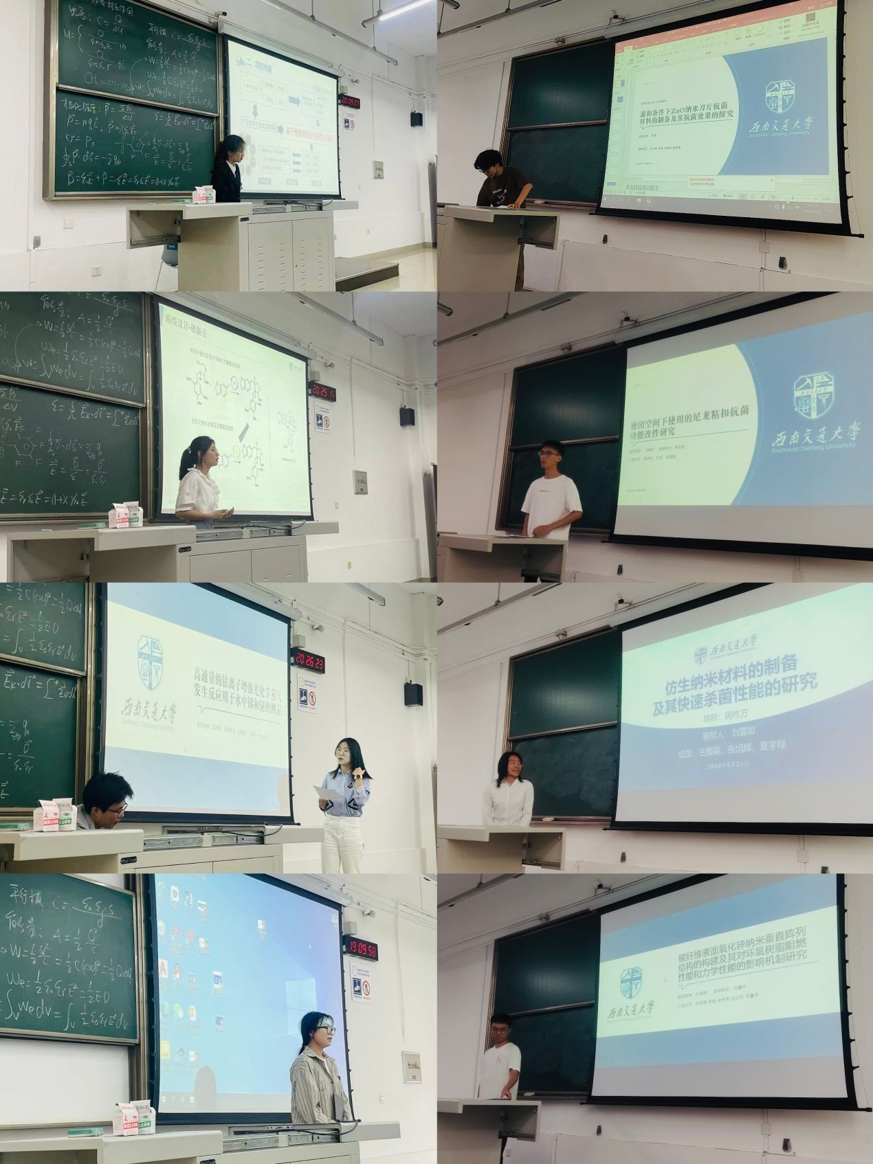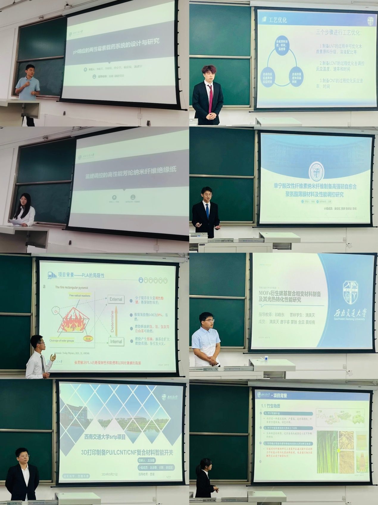 答辩在三个不同教室分为三组同时进行。在答辩会现场,气氛庄重而热烈,同学们以饱满的热情和严谨的态度,展示了他们的创新训练项目。从各类新型复合材料的合成制备,到抗菌材料的改性研究,再到新材料在生活中的智能应用,每个项目都体现了kaiyun开云官方同学们的创新精神和科研实力。