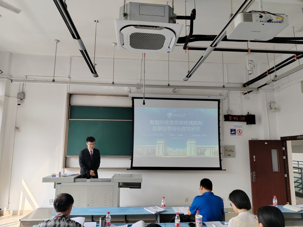 参加答辩的同学早已准备就绪,等待大学期间最后一场实战性的"考试”。他们在答辩前都经过了论文开题、中期检查等阶段精心的准备,以至于他们在答辩过程中以图文并茂的形式,结合PPT阐述自己论文的选题目的、理论框架、研究问题的方法及其实际意义。随后,评委老师针对论文内容提出相关问题,如王勇副院长提出的生物相容性怎么样,抑菌的成分如何,徐晓玲老师提出的涂层前后凝胶化,王雅雯老师提出的核磁分析中结构式,杨静晖老师提出的如何计算接枝率等这样零距离的问答,一方面是考察同学们对自己设计作品制作流程的熟悉程度,另一方面,考察同学们对专业知识的掌握程度及心得体会,以及对自己现在工作的看法。针对答辩老师的各种提问,同学们回答简明准确,虽然仍然存在不足,但是都得到了老师的充分肯定。