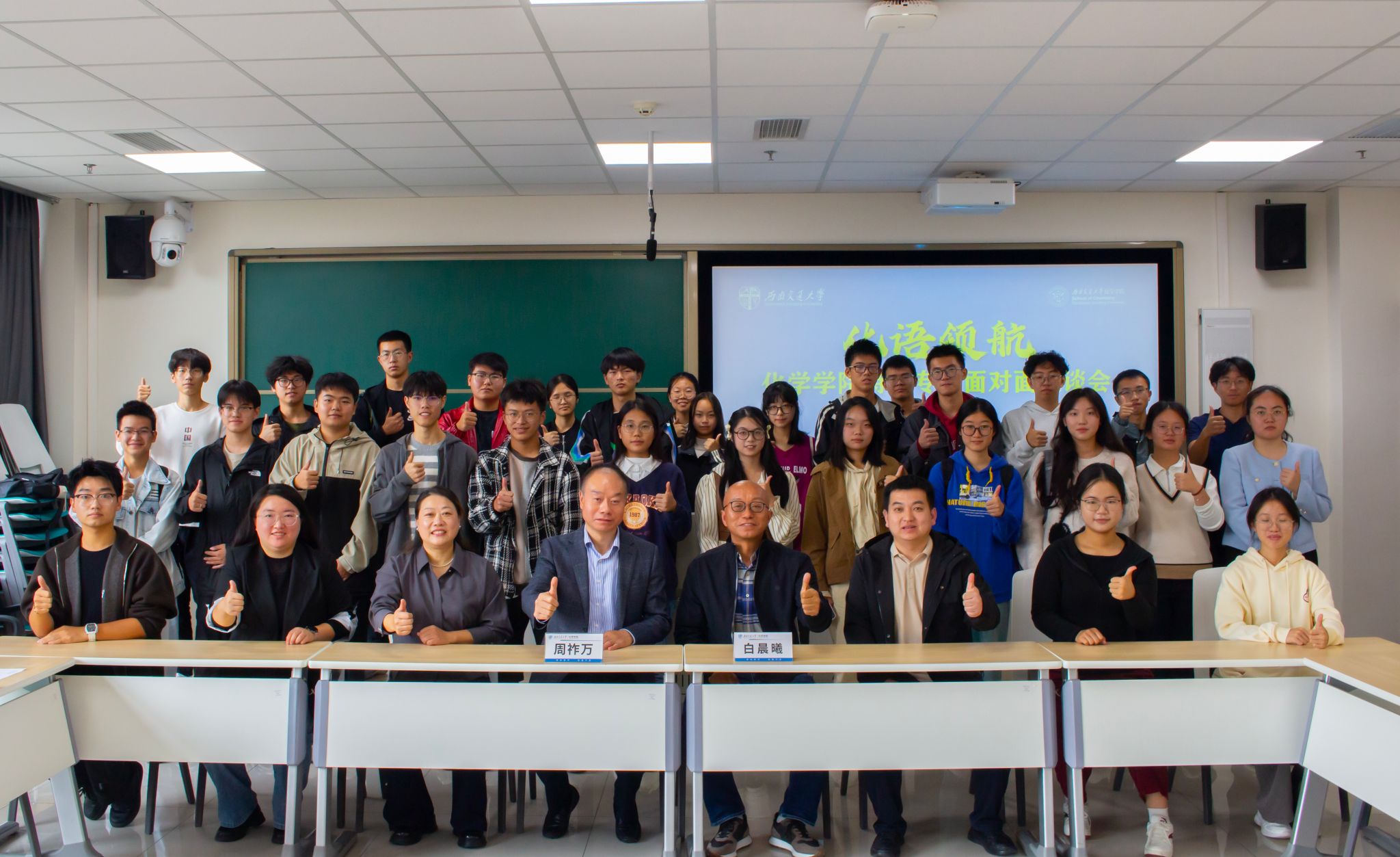 座谈会伊始,周院长生动阐释了化学学科发展的广阔前景,激发了学生们对未来方向的思考。随后,座谈会围绕化学及高分子专业的前沿趋势、就业前景,以及科研项目探索与AI融合的展望,展开了热烈讨论。与会学生积极提问,现场氛围热烈。对于学生在学习上的困惑和问题,白教授与周院长逐一解答,并结合自身学习经历及当前学习实际提供了实用建议。他们鼓励学生既要广泛涉猎前沿领域,更要注重基础理论学习,在专业学习中探索个人兴趣,丰富自身学识,并强调要做好时间分配管理、提高学习效率。