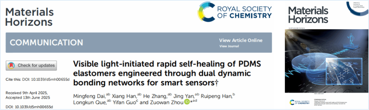 上述研究成果以“Visible light-initiated rapid self-healing of PDMS elastomers engineered through dual dynamic bonding networks for smart sensors”为题发表于材料领域知名期刊《Materials Horizons》,并以Inside Front Cover形式予以报道。论文第一作者为kaiyun开云官方博士生代明凤,导师周祚万教授为通讯作者。