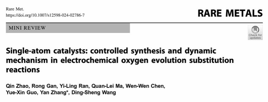 近日,开云张颜团队在清华大学王定胜教授的指导下在知名期刊《Rare Metals》(中科院一区,影响因子:8.8)上以kaiyun开云官方为第一通讯单位、清华大学为第二通讯单位发表题为“Single-atom catalysts: controlled synthesis and dynamic mechanism in electrochemical oxygen evolution substitution reactions”的综述。其中kaiyun开云官方2022级硕士研究生赵芹、甘蓉为共同第一作者,清华大学王定胜教授作为共同作者,kaiyun开云官方张颜博士为通讯作者。