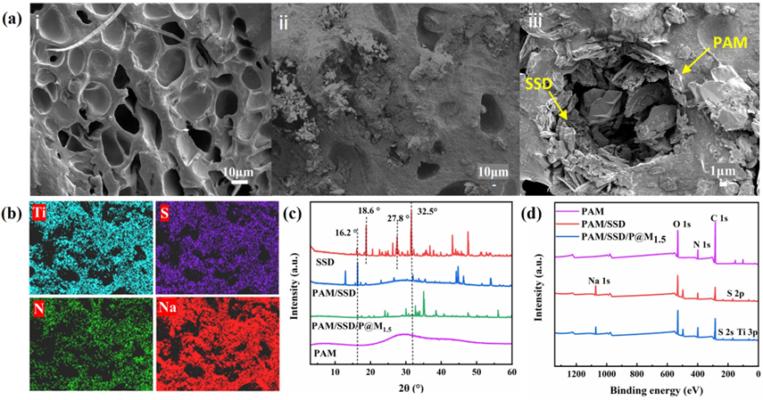 图2. (ai) PAM和 (aii,aiii) PAM/SSD/P@M1.5的微观形貌以及 (b) EDS图。(c) SSD, PAM/SSD和PAM/SSD/P@M1.5的XRD谱图和 (d) XPS谱图。