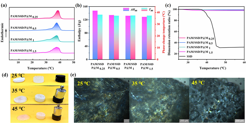 图3. (a) PAM/SSD/P@M的DSC曲线以及 (b) 相变温度和热焓值。(c) SSD, PAM/SSD和PAM/SSD/P@M1.5的形状维持率。(d) 防泄漏测试。(e) SSD从25 ℃加热到45 ℃的POM图。
