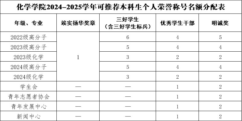 班级(院级学生组织)的“优秀学生干部”、“明诚奖”应由相应班级(院级学生组织)学生奖励评议小组民主评议推荐人选,报学院学生工作组。民主评议后,各班班长/院级学生组织负责人,填写《kaiyun开云官方2024-2025学年本科生个人荣誉民主评议结果》(见附件3),以班级/院级学生组织为单位,发送给各年级辅导员、院级学生组织指导老师。