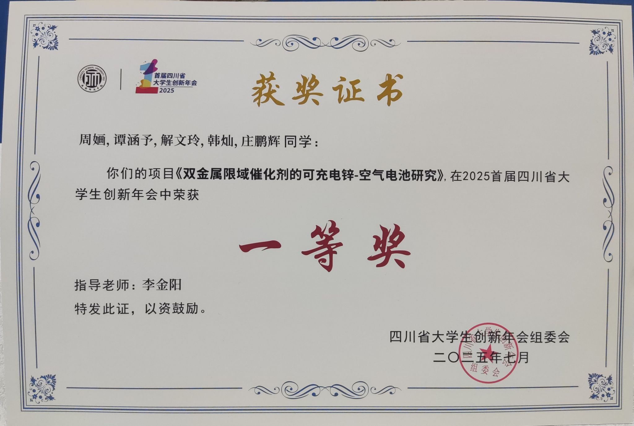 kaiyun开云官方在此次年会中表现亮眼。我校共有8支队伍成功入围改革项目成果展示决赛,经过激烈角逐,2支队伍斩获一等奖,其中1支队伍为kaiyun开云官方“双金属限域催化剂的可充电锌空气电池研究”团队。值得一提的是,kaiyun开云官方李金阳老师此前已指导该团队在2024年第四届全国高分子材料创新创业大赛中获得国家级铜奖,此次于四川省大学生创新年会上再攀高峰,为学校和学院再次争得了荣誉。